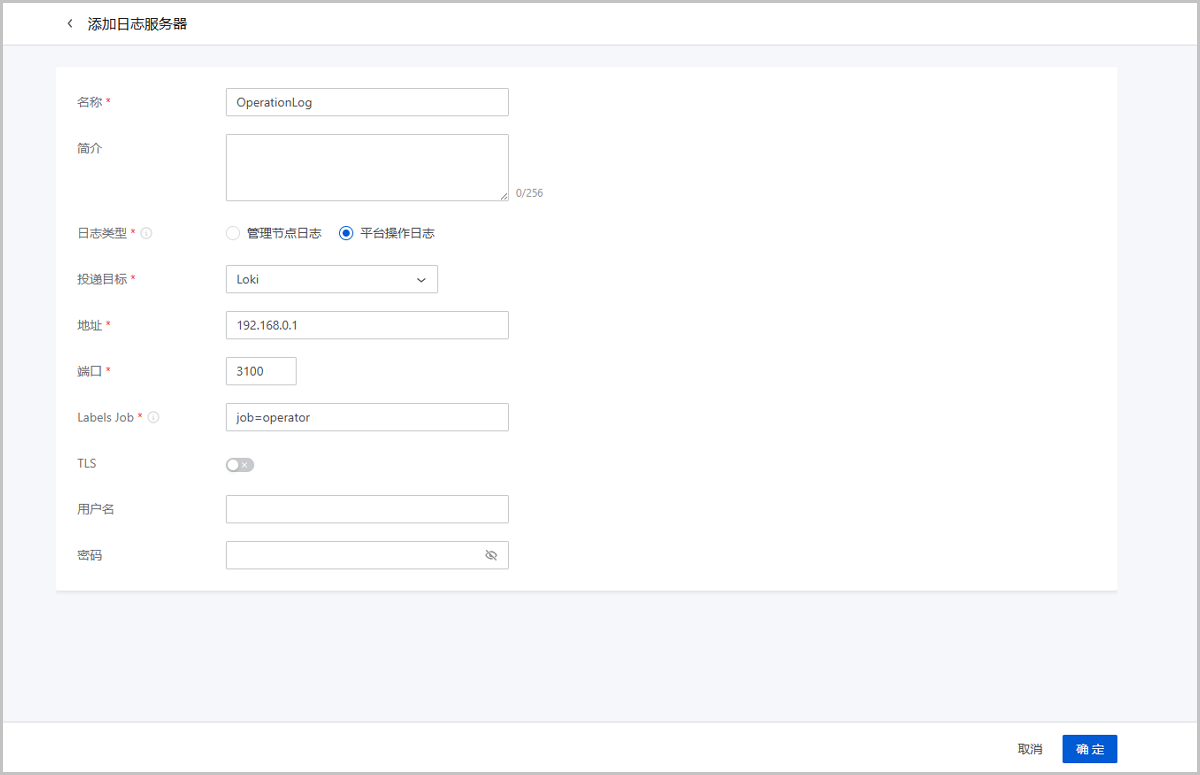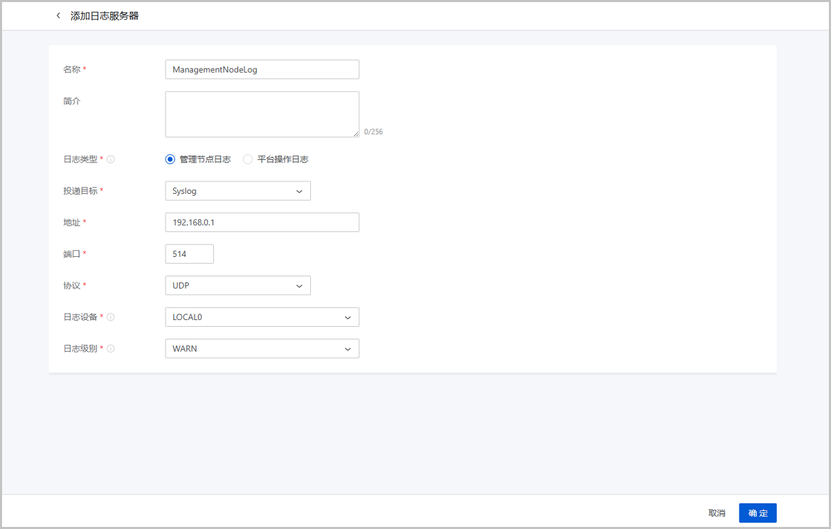 在ZStack Cube 旗舰版主菜单,点击,进入日志服务器界面,点击添加日志服务器,弹出添加日志服务器界面。