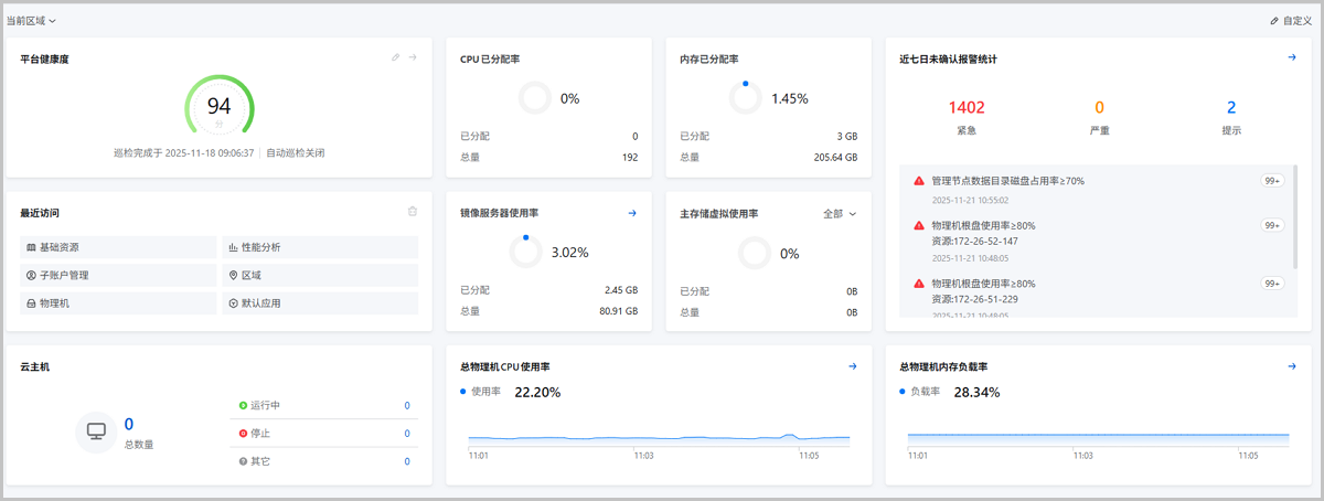 | 平台用量统计 | CPU | 已分配率 | 统计当前区域/所有区域内CPU使用情况,并直观展示CPU已分配百分比,以及CPU已用量和总量。 |