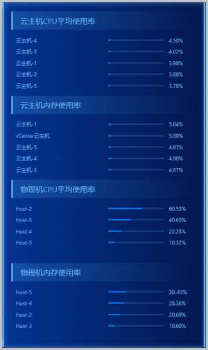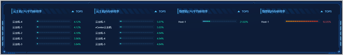 对所选虚拟化和区域内正常工作的云主机/物理机的CPU、内存资源使用情况进行统计分析,以云主机CPU负载、云主机内存负载、物理机CPU负载、物理机内存负载为指标,分别挑选出各指标下负载压力最高的前五台机器,进行实时展示监控。