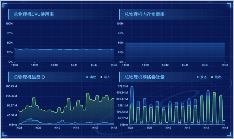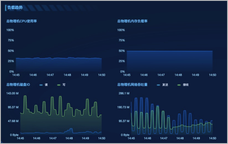通过对所选虚拟化、区域中数据中心的全部物理的CPU、内存、磁盘、网络资源使用情况进行统计分析,以全部物理机的总CPU负载压力、总内存负载压力、总磁盘IO性能、以及总网络吞吐性能为指标,分别进行实时展示监控。