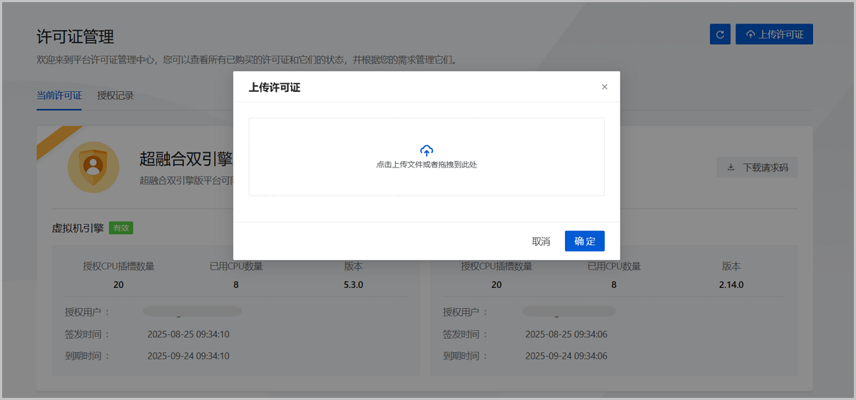 在许可证管理界面,点击右上角的上传许可证,弹出上传许可证界面,将获取的许可证上传到此处即可。