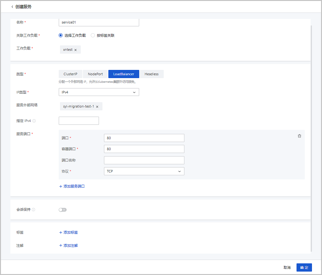 在ZStack Cube 双引擎版主菜单,点击,进入服务界面。点击创建服务,弹出创建服务界面。