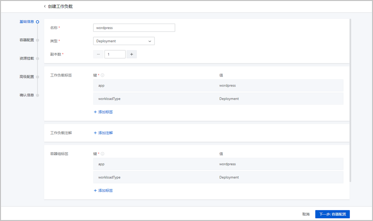 在ZStack Zaku主菜单,点击容器编排 > 应用管理 > 工作负载,进入工作负载界面。点击创建工作负载,弹出创建工作负载界面。