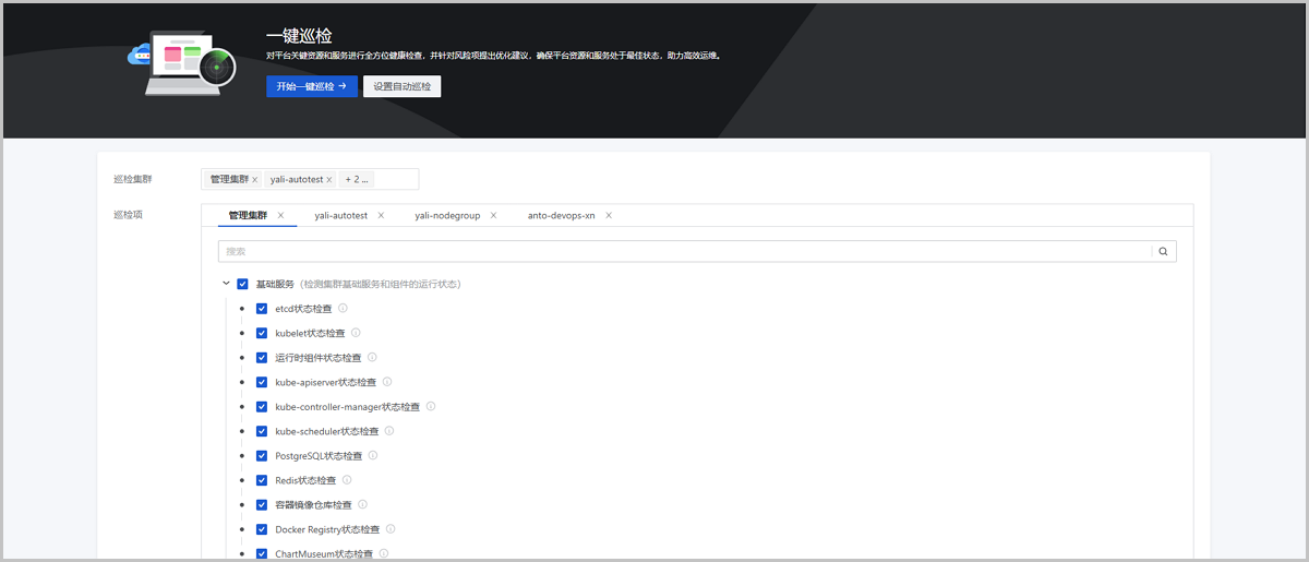 一键巡检针对管理集群和业务集群提供基础服务、计算、网络三类巡检项,支持对集群节点、镜像服务器、网络组件等平台关键资源和服务进行巡检: