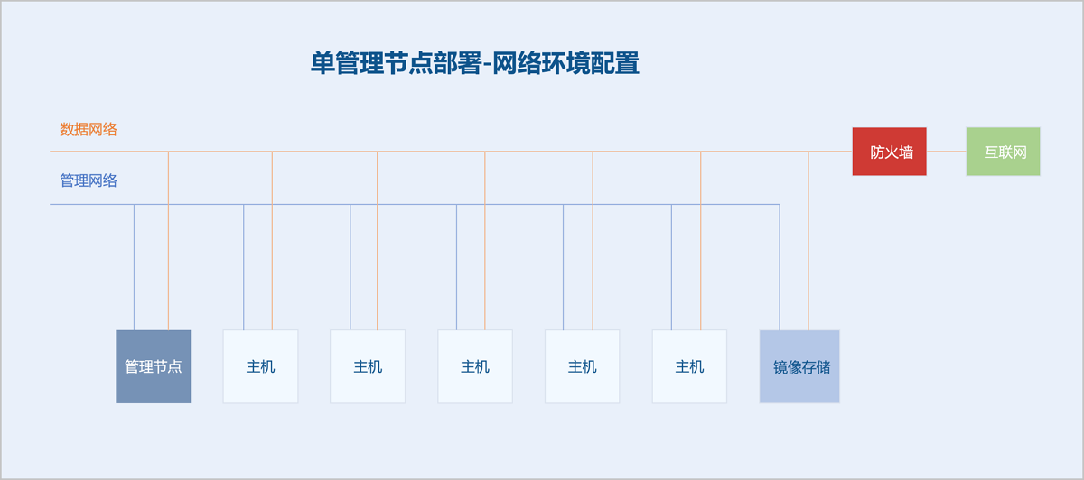 每台服务器均连接到管理网络和数据网络,其中数据网络可以通过防火墙访问互联网。管理网络是管理节点管理主机、虚拟机、硬盘等虚拟化资源的网络。数据网络是虚拟机提供数据服务的网络。