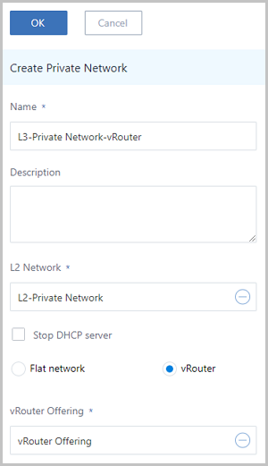 - When you use the private network with the vRouter network type, this private network can reach the Internet by using a vRouter.