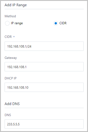 - CIDR: Enter a CIDR for the network range, such as 192.168.108.1/24.