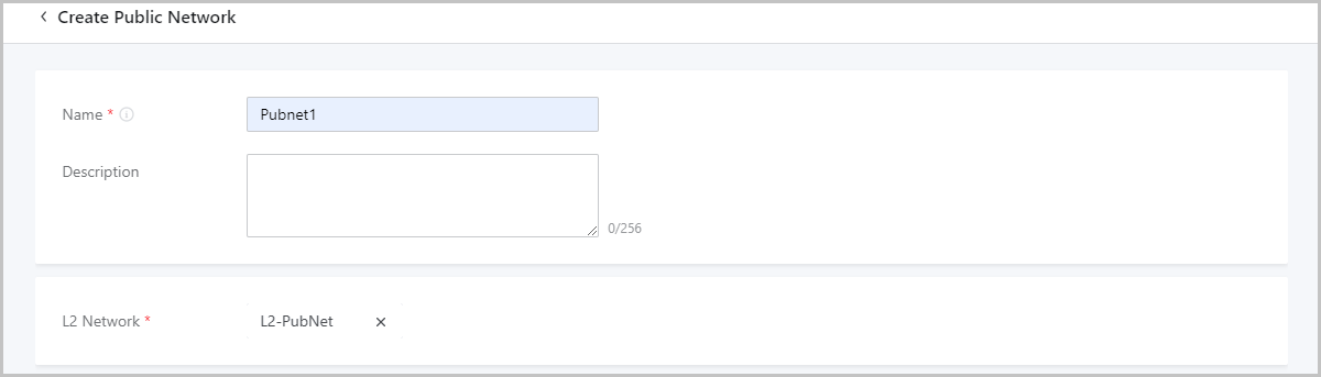 On the main menu of ZStack Cloud, choose . On the Public Network page, click Create Public Network. The Create Public Network page appears.