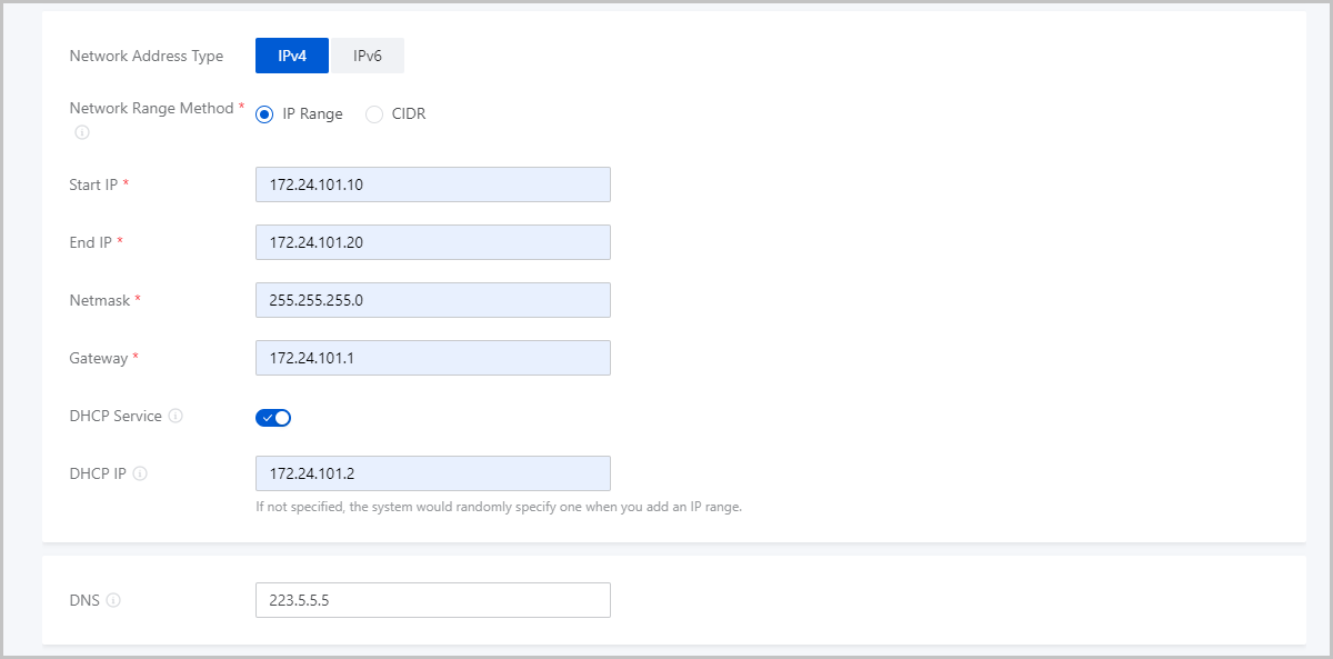 - Netmask: Set a netmask for the network range, for example, 255.255.0.0.