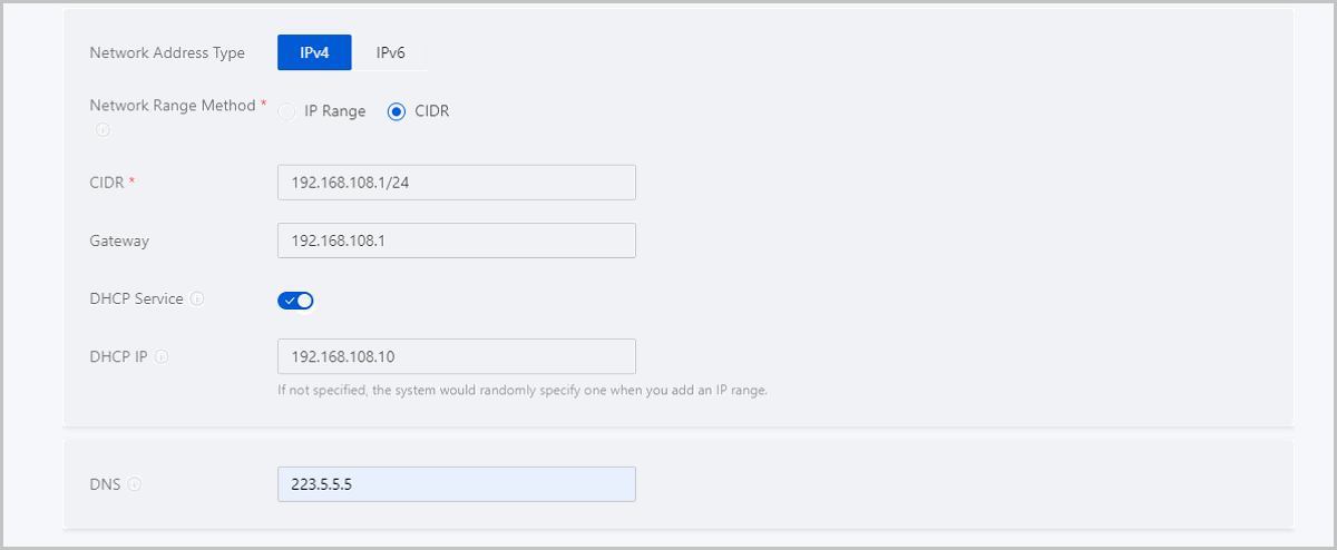 If you select CIDR, you need to set the following parameters:- CIDR: Set a CIDR block for the public network, for example, 192.168.108.1/24.