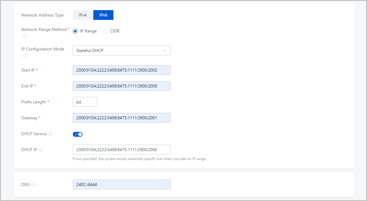 VM creation may fail. - Gateway: Set a gateway for the network range, for example, 2000:910A:2222:5498:8475:1111:3900:2001.