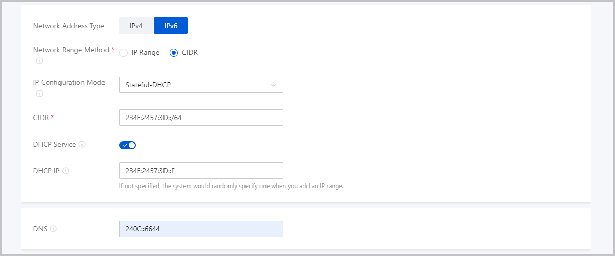 - CIDR: Set a CIDR block for the public network, for example, 234E:2457:3D::/64.