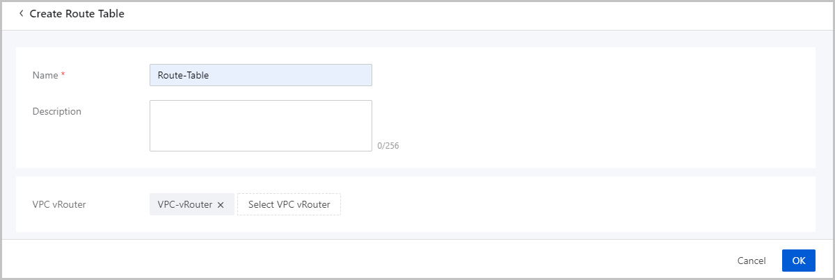 - VPC vRouter: Optional. Select a VPC vRouter to which the route table is attached.