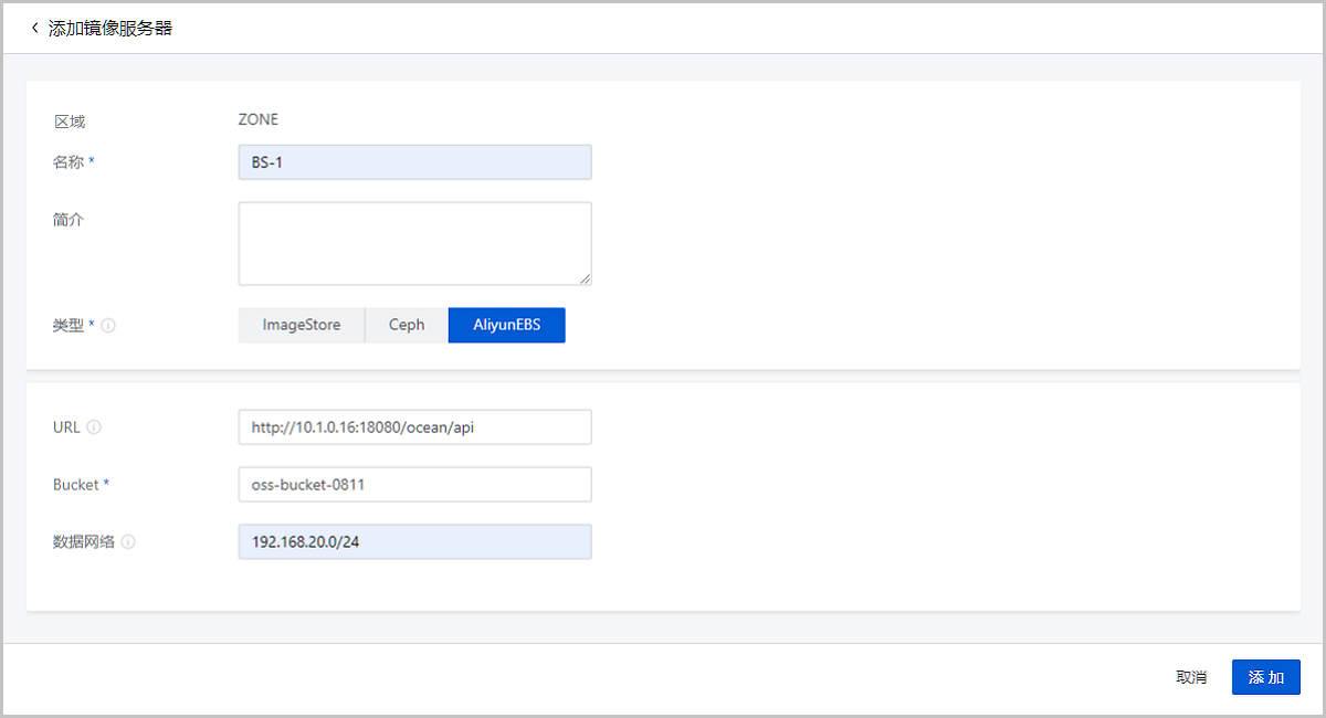 - Bucket:选择已在ZStack Cloud混合云界面添加好的OSS