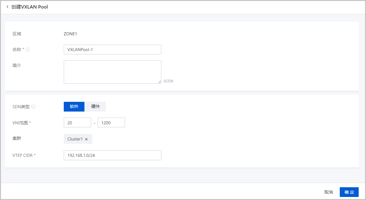 在ZStack Cloud主菜单,点击,进入VXLAN Pool界面。点击创建VXLAN Pool,弹出创建VXLAN Pool界面。