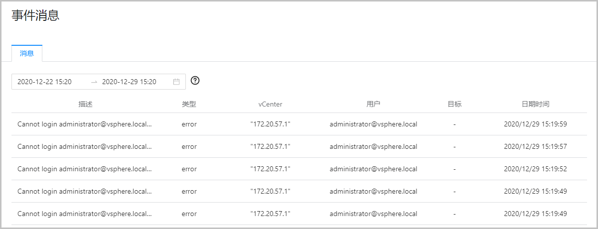事件消息支持查看vCenter报警消息,包括消息描述、类型、所属vCenter、触发用户、目标和日期时间信息。