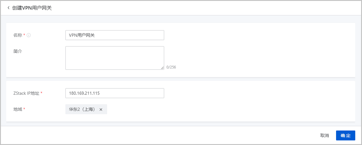 在ZStack Cloud混合云主菜单,点击,进入VPN用户网关界面,点击创建VPN用户网关,进入创建VPN用户网关界面。