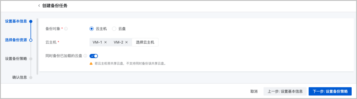 选择需要备份的本地云主机/云盘、备份云主机是否同时备份已加载的云盘。