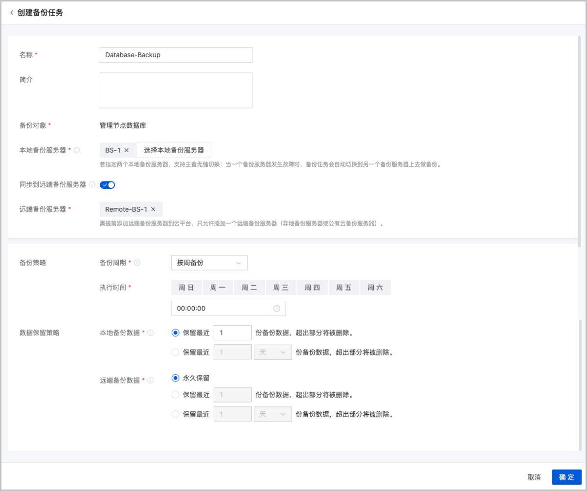 | 设置备份服务器 | 设置备份任务所对应的本地备份服务器或远端备份服务器。 |